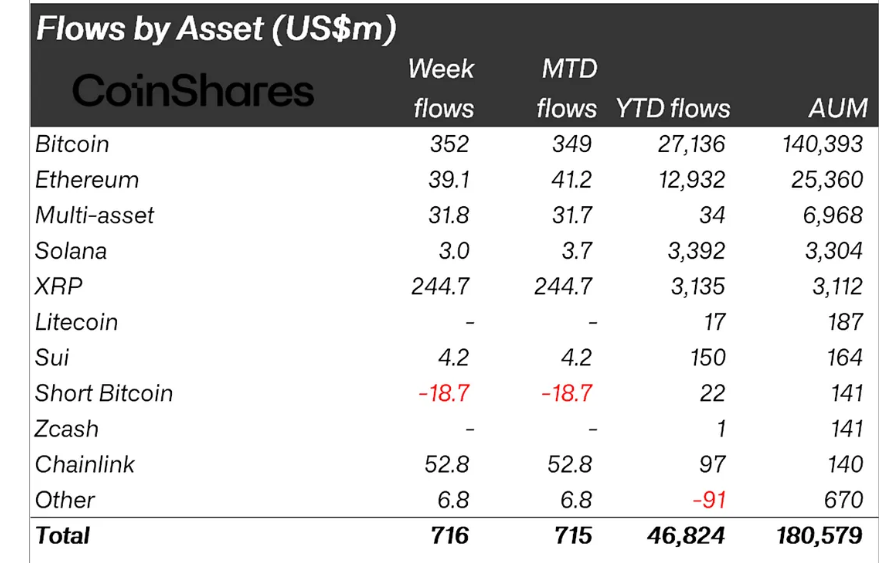 The institutional cryptocurrency report tracking institutional investors’ interest in cryptocurrencies has just been released. It was published. The report contains important details. There was a total net inflow of $716 million across all crypto products over the past week. While the total asset value of all investment products reached 180 billion dollars, it is still below the ATH level. AUM reached an all-time record of $264 billion. Still, the nearly 8% rise from the bottom in November is positive.