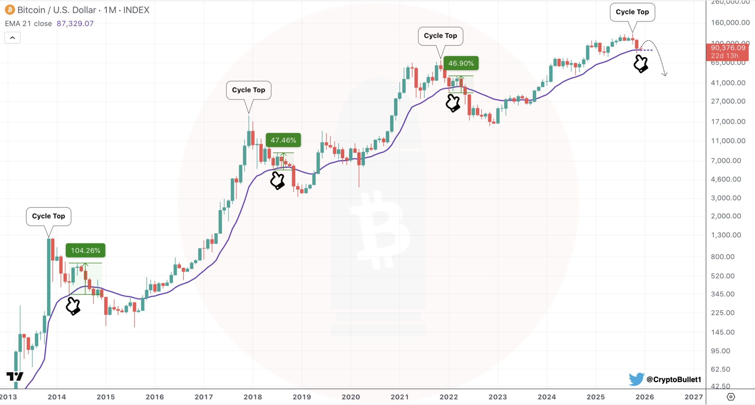 Why am I waiting for a decent Dead Cat Bounce before it drops below $80,000? EMA21 is an important support level. When BTC peaks and forms the first wave of a bear market, it usually finds support at EMA21 on the monthly time frame and bounces back (lower high). This From Dead Cat Bounce Then EMA21 eventually breaks and BTC gains downward momentum.”