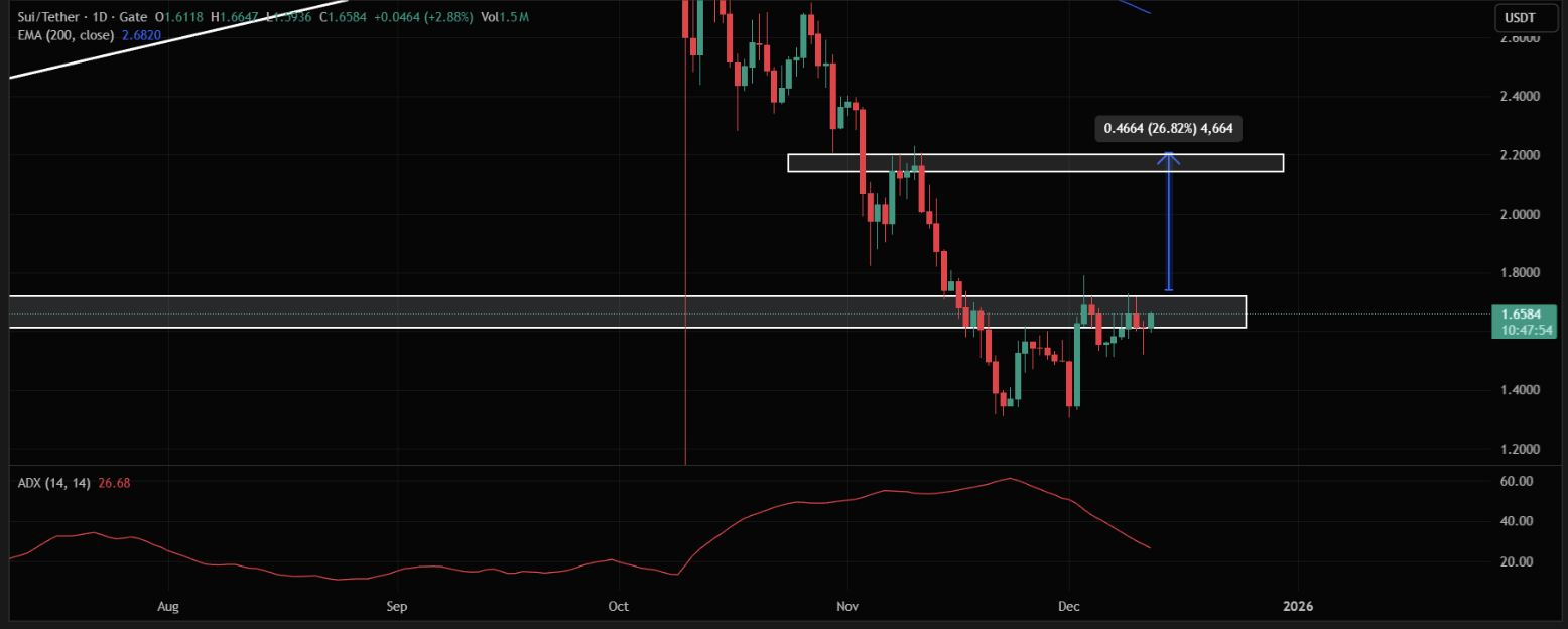 From a technical perspective, SUI has regained the important support zone around $1.60. The Average Directional Index (ADX) on the daily chart is at 26.68, confirming that the current trend is strong. According to analysts, if the price closes daily above $ 1.75, a new rise of 26% may reach $ 2.20 levels.