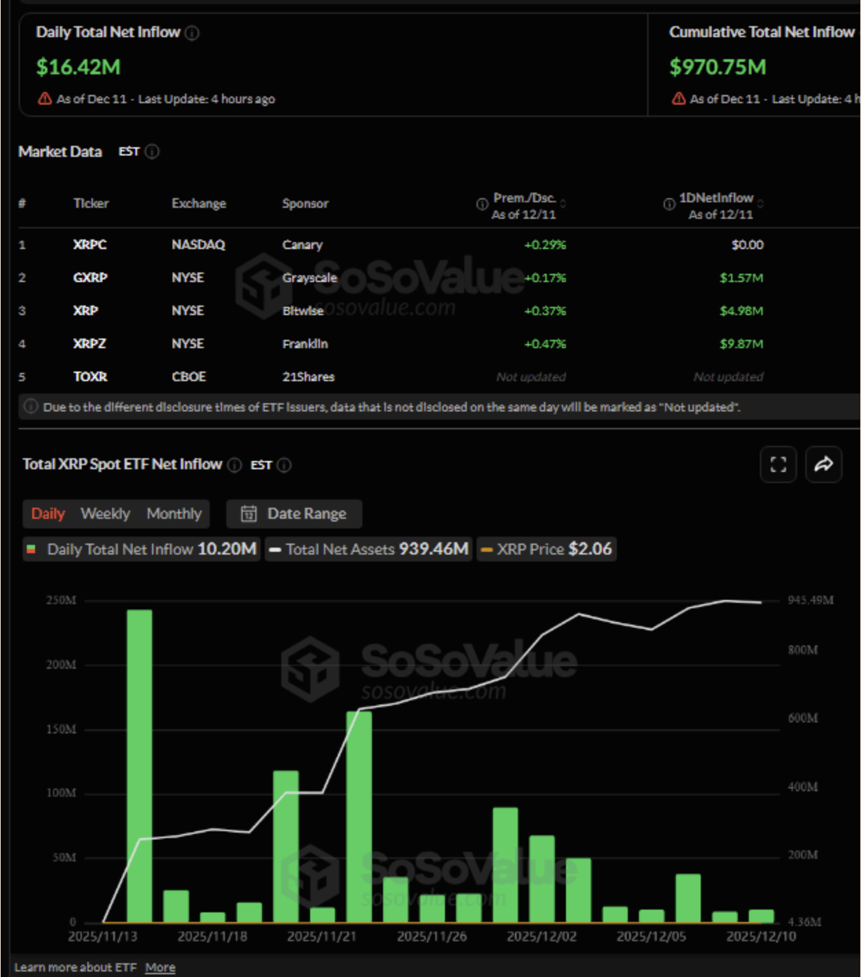 According to the latest data, XRP recorded a net fund inflow of $ 16.42 million, leaving behind an uninterrupted streak of 19 days. Despite this, the price remains limited, suggesting that investors are quietly accumulating their positions. In particular, the spot XRP ETF launched by 21Shares and traded under the ticker TOXR has expanded access to XRP in regulated markets. However, this step is not priced in the short term.