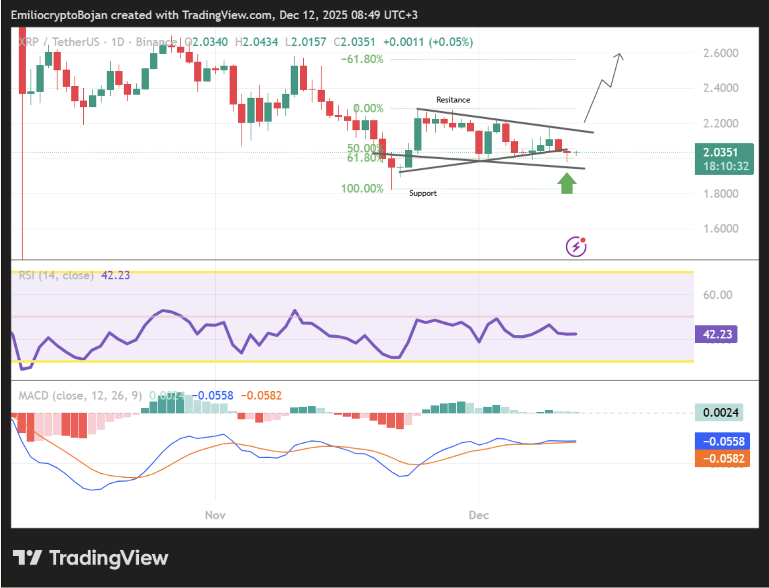 At press time, XRP continues to trade at the 50 percent Fibonacci retracement level around $2.03. The gradual decrease in volatility indicates a squeeze within the ascending triangle formation. The RSI indicator is hovering around 42 levels, signaling neither oversold nor a strong recovery; This reveals the instability in the market. On the MACD side, it seems that the compression has increased and a possible positive intersection is approaching.
