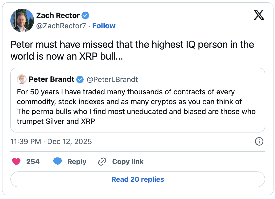 After Brandt’s words, rapid responses came from the XRP front. Zach Rector, a well-known XRP commentator, responded with a remarkable example. YoungHoon Kim, who was previously a strict Bitcoin maximalist and introduced himself as “having the highest IQ in the world”, announced that he would start buying XRP on December 12, causing surprise in the markets. This development was interpreted as an important signal that the perception towards XRP may change.