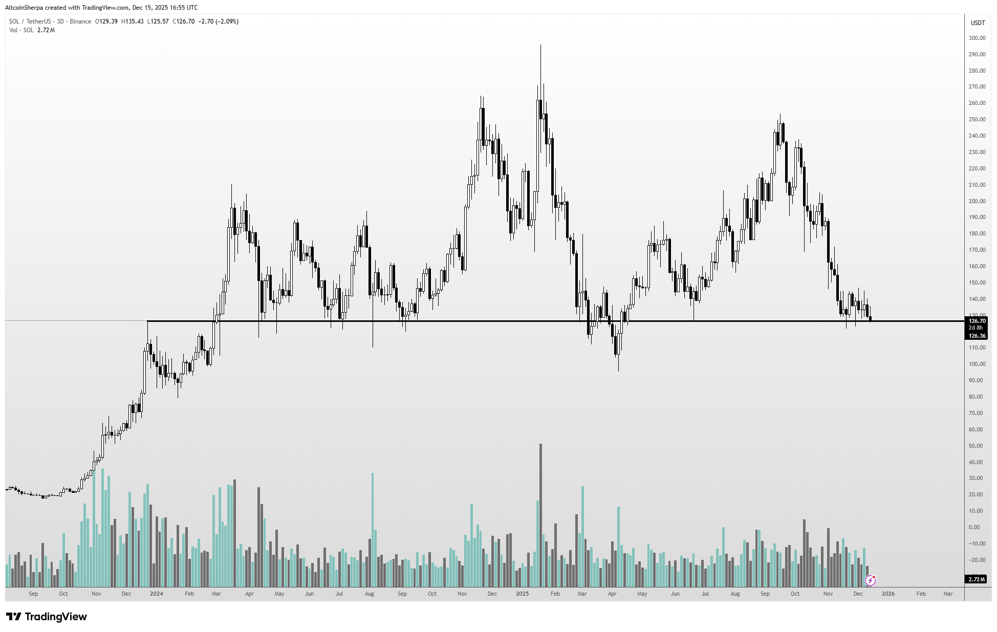 Analyst with the pseudonym Altcoin Sherpa who shared the Solana chart in SOL Coin He wrote that he expects a rapid decline to $100 if the $120 support is lost. The altcoin is now at $124.