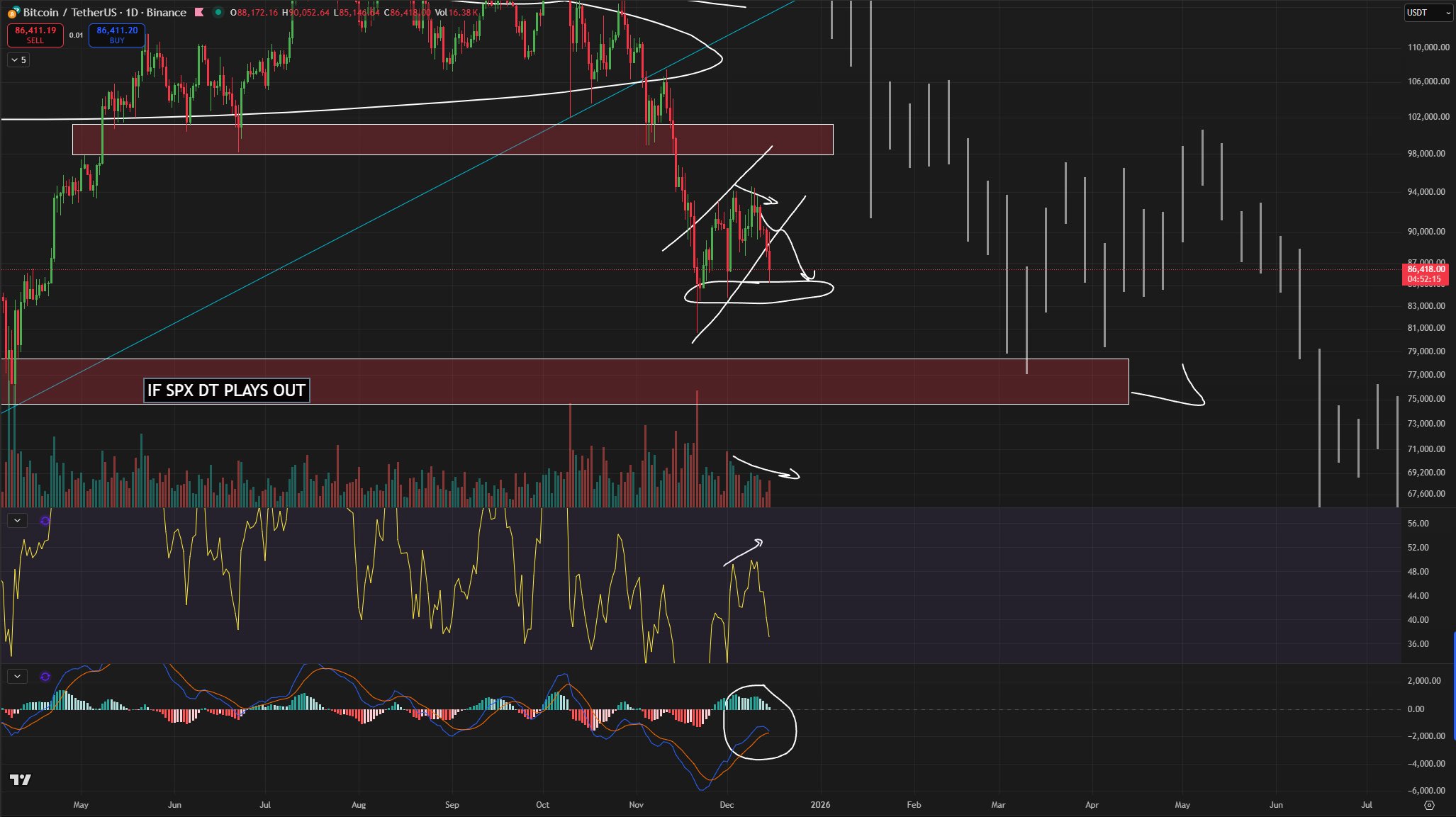 “It’s still going perfectly according to plan. Bear waves + price movements are pulling us down. My only problem right now is that the sales volume is not very high, so we will probably get another bounce around 84k. (He wrote in his analysis 5 hours later that this might not happen, and since BTC had a weak bounce, he may be right.) Even if we have a bounce, I believe we will reach 76k when the time comes.”