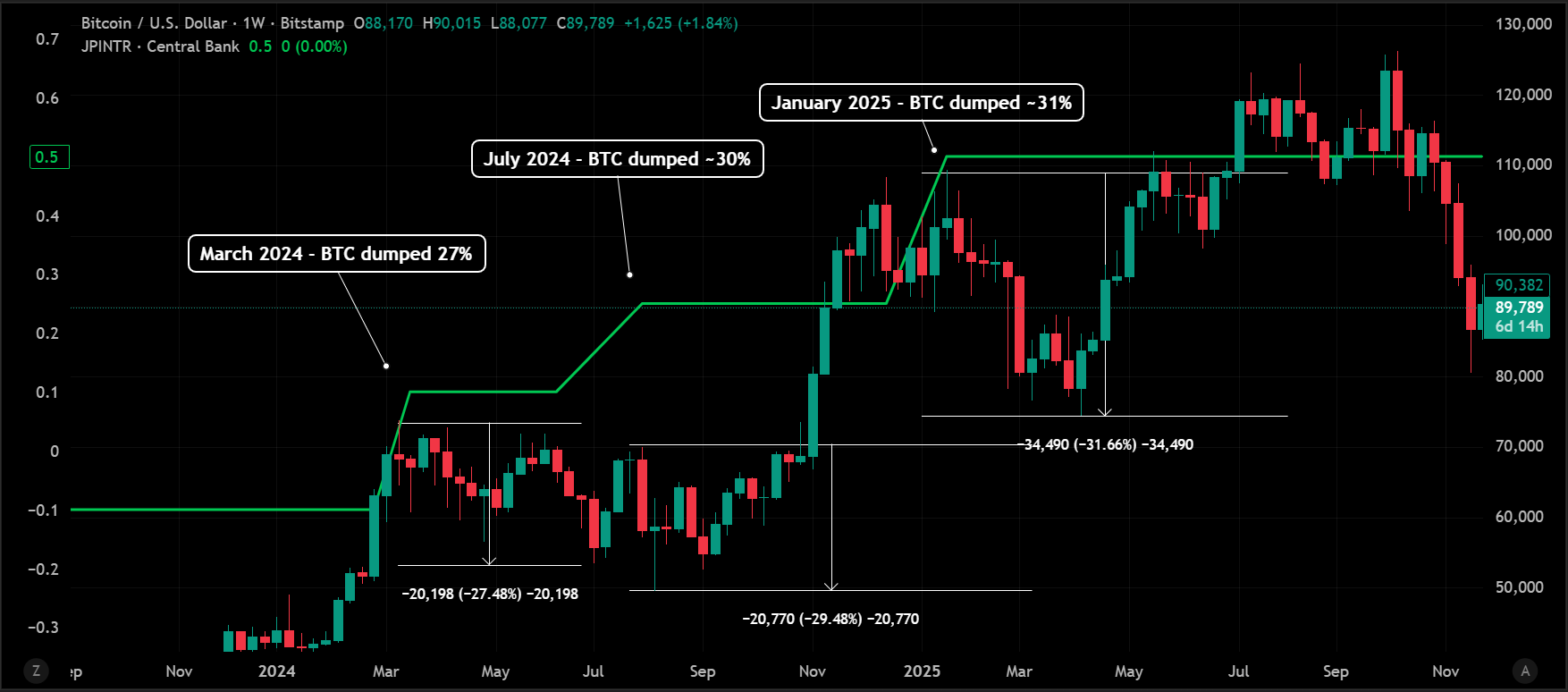 “Bitcoin lost over 20% in the last 3 interest rate hikes of the BOJ