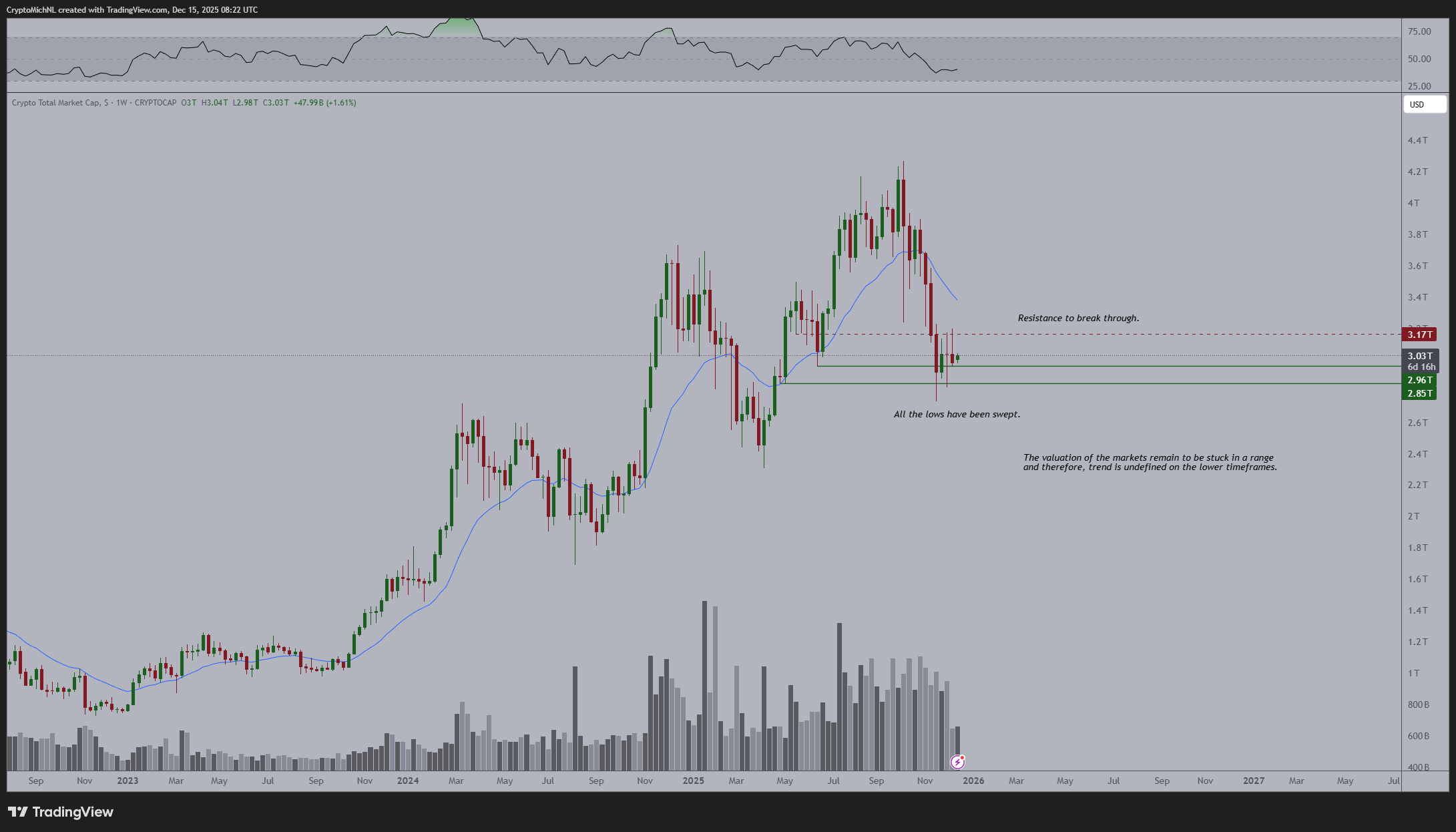 poppe today TOTALCAP He glanced at the chart and says that after a correction similar to February 2025, current conditions resemble the chart after the COVID-19 crash. The price paused for a while, the direction was unclear, and then the trend slowly began to move upwards again. $3.2 trillion and $2.85 trillion are resistance and support points under current conditions. When one of the two breaks, we will see where we are going.