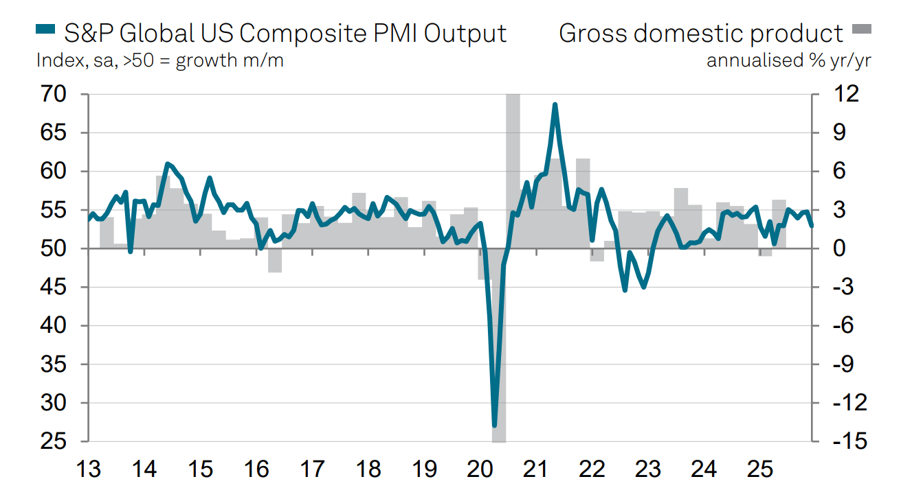 “Growth has been slowing for two months, although survey data forecasts annual GDP growth of around 2.5% in the fourth quarter. Economic activity could weaken further as we head into 2026, with new sales falling particularly sharply ahead of the holiday season. “Signs of weakness are also broad-based; Factory orders fell for the first time in a year, while the flow of work into the broad services economy came to a near halt. While manufacturers continue to increase production, declining sales point to unsustainable production levels that must be reduced unless demand revives in the new year.