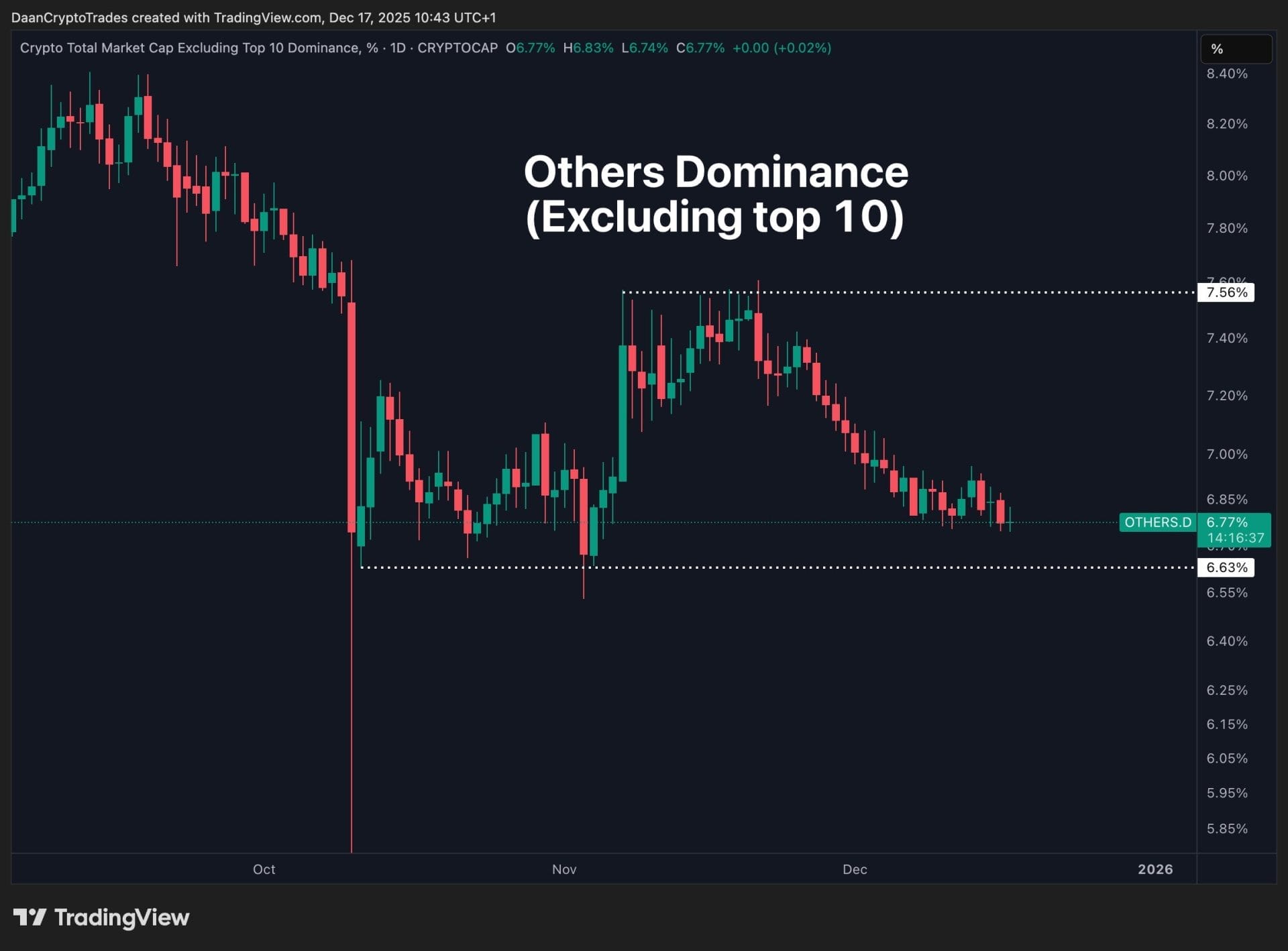 “OTHERS.D gives a good overview of overall altcoin strength and dominance. What we can see here is that we are basically back to the October 10 (big drop) level right after the wild wicks formed. Prices rose from that point into November, but have since stalled and lost a lot of value again.”