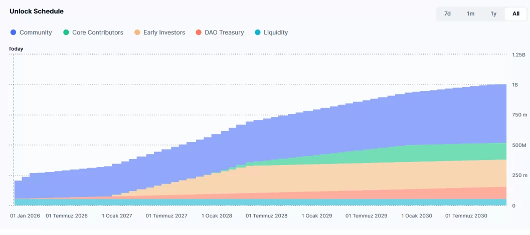 Its market value is just at $26 million and its FDV is $130 million. Lock openings will not be very fast. On January 19, 3.17% of the supply, or 31.69 million tokens, will enter circulation. There will be a lock opening at the same rate on February 19. However, there is no further unlocking until December 19, so you can be hopeful as inflation will not be incredibly high. The bad news is that as of 2027, there will be a 2% token unlock every month, meaning inflation will be 8.34% in the first year and 24% in the second year.