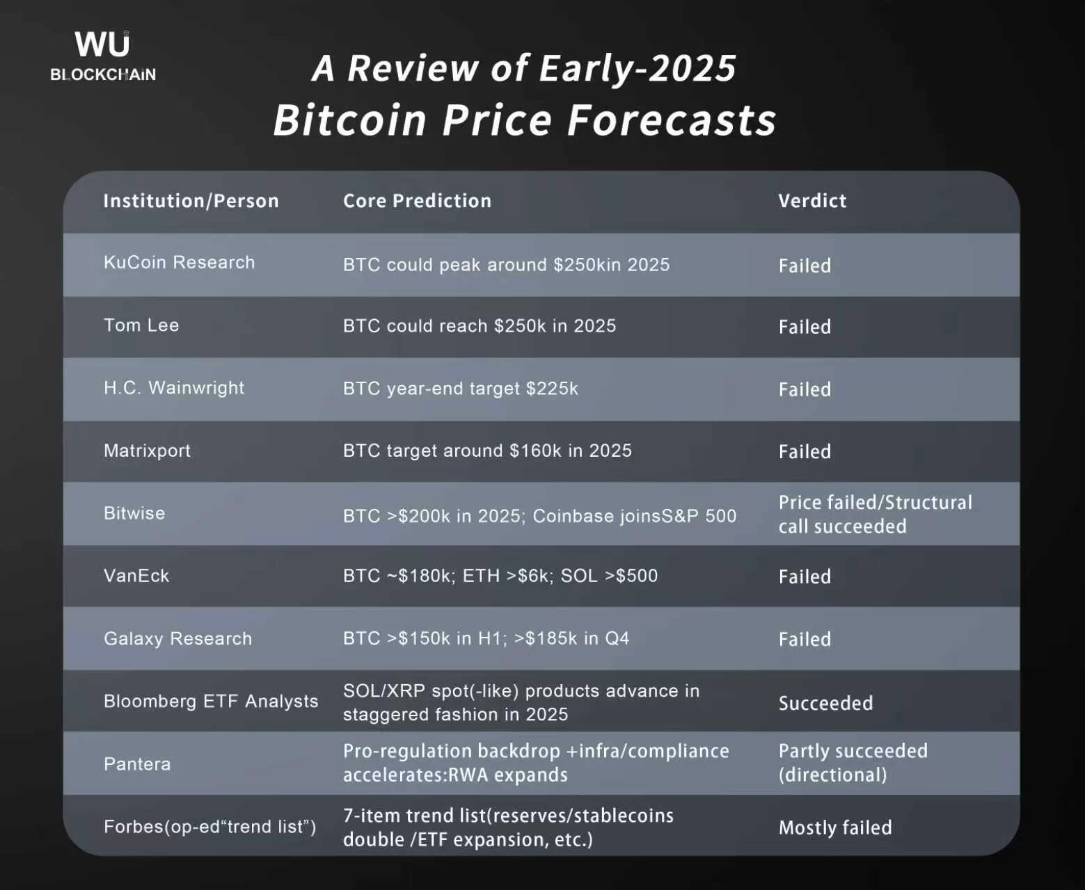 Wu Blockchain compiled The foresight examples in the list show that the highest goals were repeatedly written off as failures. For example KuCoin Researchpredicts that Bitcoin could peak at around $250,000 in 2025. Tom Lee He also argued that $250,000 could be reached in 2025, and both predictions did not come true. H. C. Wainwright gave a target of $225,000 for the end of the year, matrixport He shared a target of around $160,000 in 2025. Both of these predictions failed due to the difference between expectation and outcome.