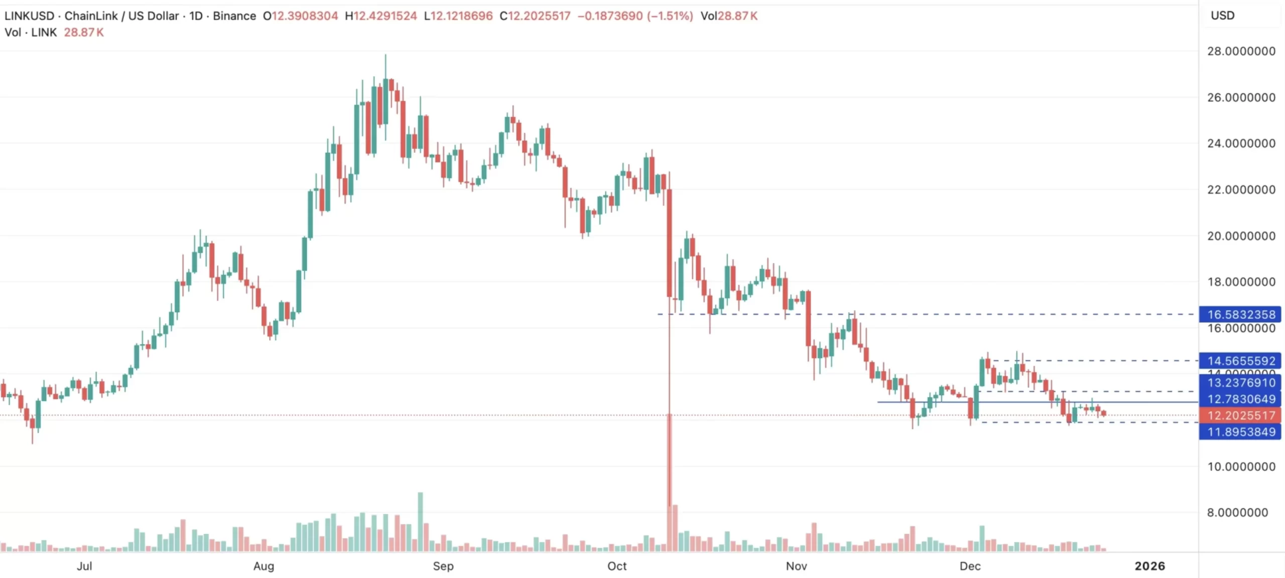 Chainlink $12.17The price of LINK coin, in short, has continued its downward trend since October and is stuck at a critical threshold in the 12 dollar band. Although volatility has calmed down somewhat, the stability signal remains weak on the daily chart. The failure of reaction purchases to overcome important resistance areas indicates that sellers still have not given up control. The market appears to be approaching a decision point that could determine LINK’s next direction.