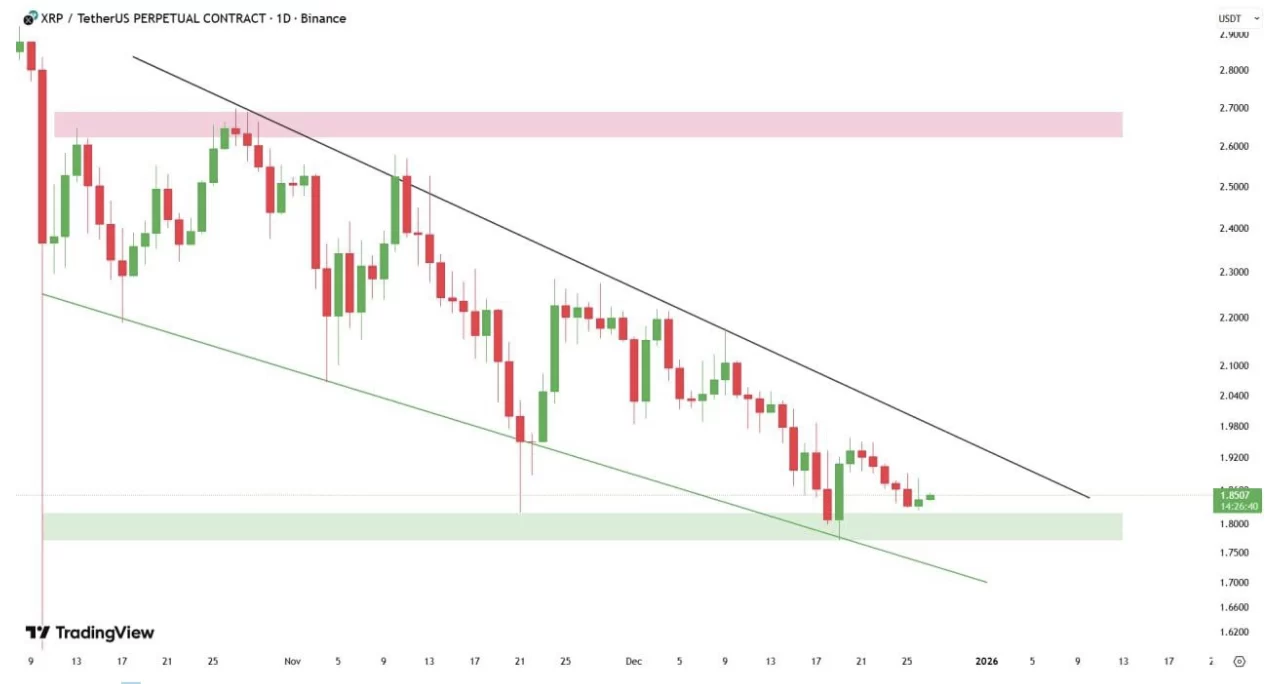 XRP appears to be holding above a strong support point at around $1.82. Attempts to fall below this demand zone have failed three times recently. The first attempt was the $1.82 low on November 21, the second was the $1.77 level seen on December 19, and the last was the $1.82 drop three days ago.