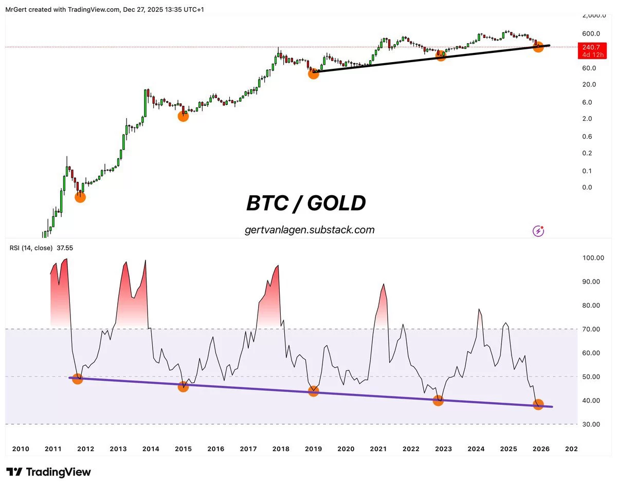 Bitcoin’s historical undervalue against gold is a harbinger of greater rises. The correlation cycle chart above also raises hopes for 2026.