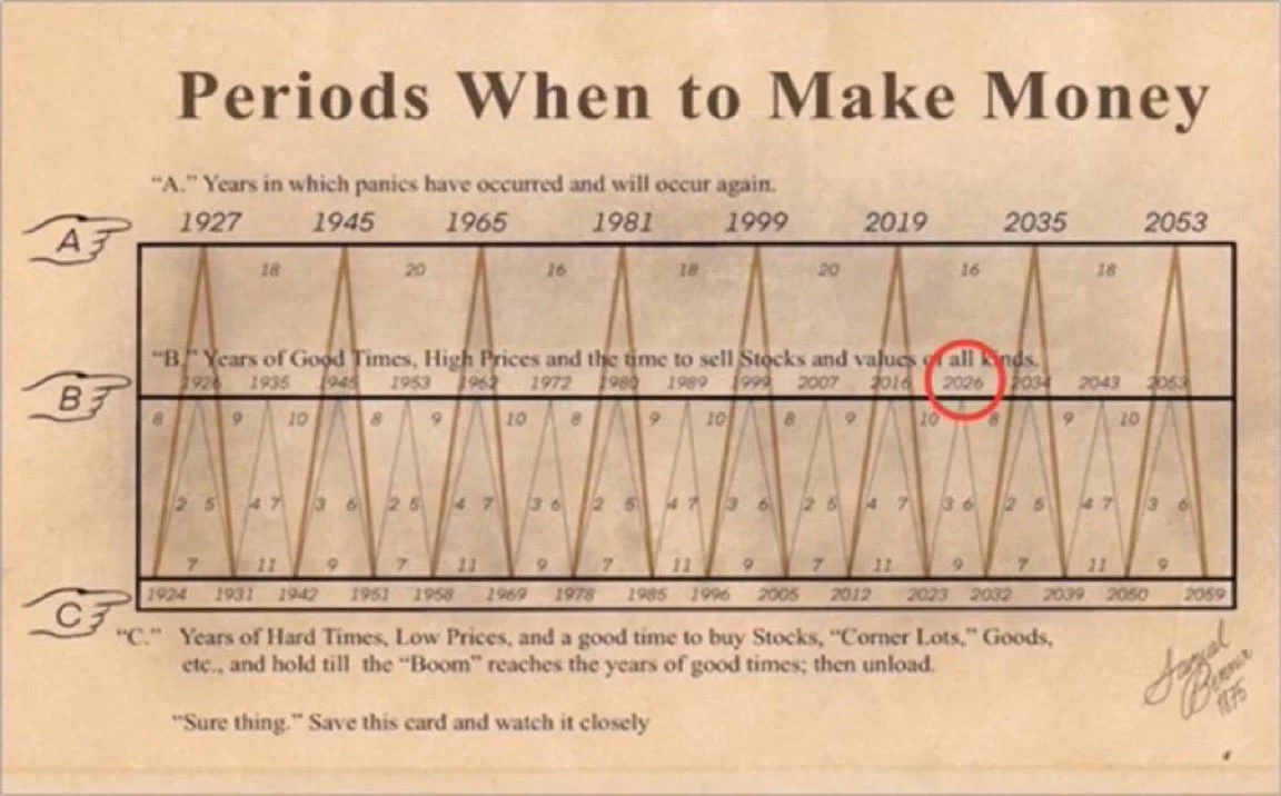 Last 200 years Benner cycle chart He says that “the peak point will be reached in 2026” and then the decline phase may begin. This cycle, which was put forward like a prophecy by Samuel Benner in 1875, consists of 3 phases: panic years, good times and difficult times.