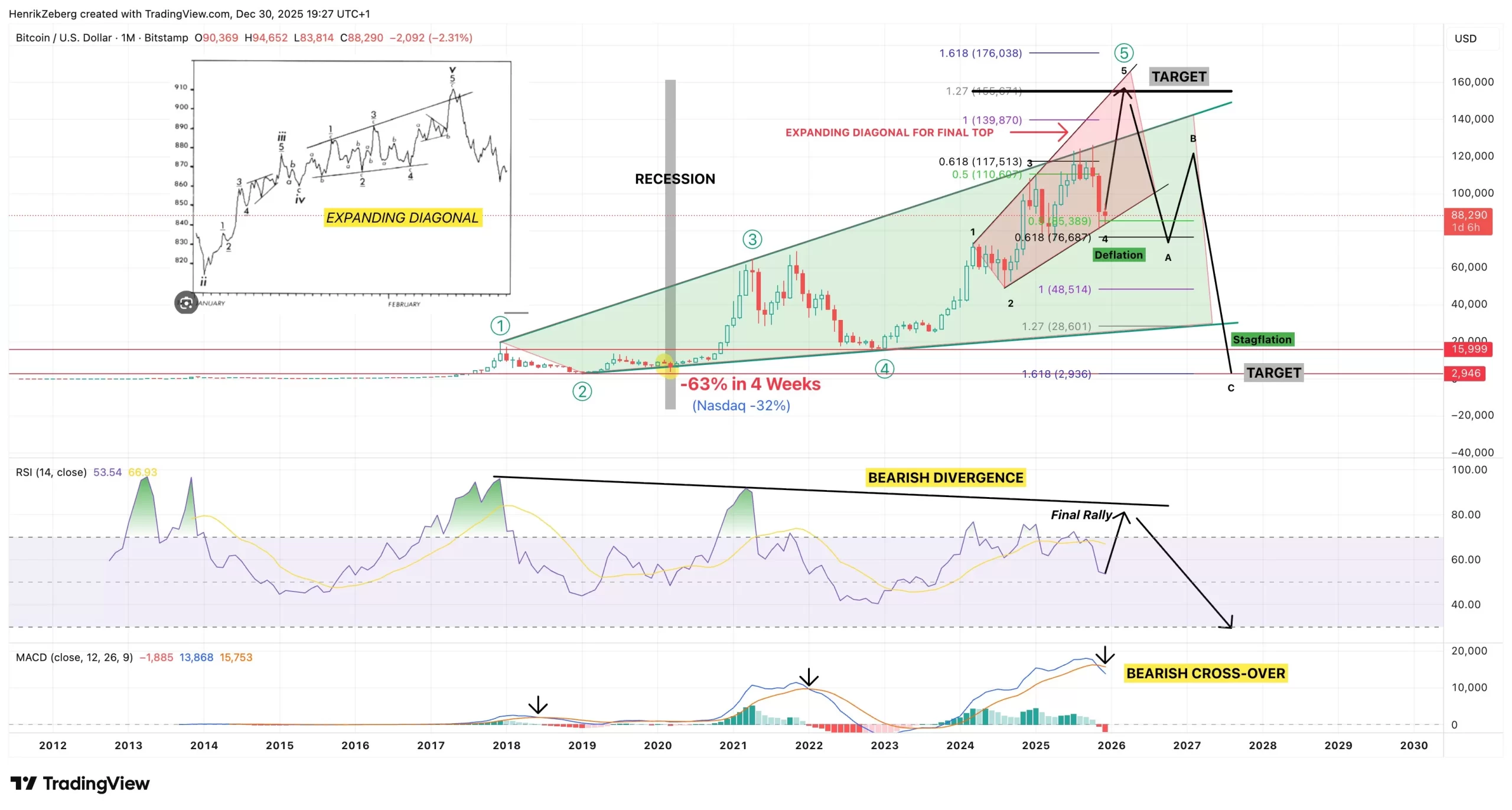 Henrik Zeberg, one of the well-known names in the financial world Bitcoin He is also closely interested in. The analyst, who said in his last market assessment that we were in the peak region of the expanding diagonal, shared the chart below and warned that we would experience destruction after the peak at 154 thousand dollars.