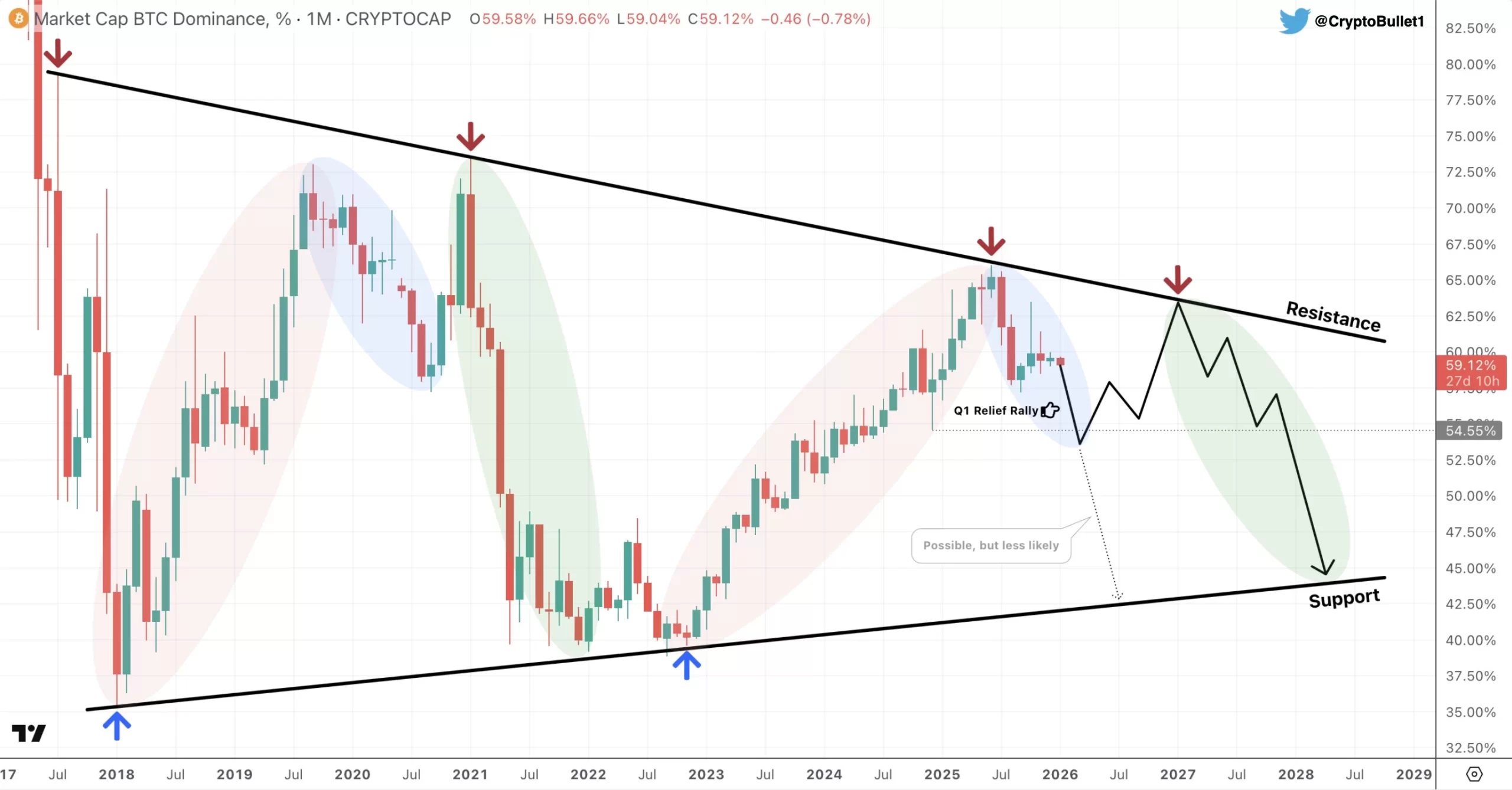 Analyst with the pseudonym CryptoBullet BTC market dominance (BTC.D) says it will fall to the support level this year and there will be at least a relief rally for all altcoins. Even when BTC.D falls to 54%, most cryptocurrencies can make good gains, but the target is the 45% band. According to Bullet, we are at the exact time when we will experience the trailer of the altcoin season. There will be a subsequent BTC.D increase followed by a much larger altcoin rally.