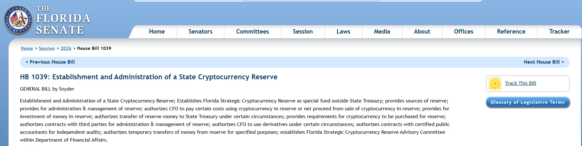 “Establishes the Florida Strategic Cryptocurrency Reserve as a special fund outside the State Treasury; provides reserve resources; provides for the management and administration of the reserve; authorizes the CFO to pay certain costs using the cryptocurrency in the reserve or the net proceeds from the sale of cryptocurrency in the reserve; authorizes the deposit of funds in the reserve; authorizes the transfer of reserve funds to the State Treasury under certain conditions; establishes the requirements for the cryptocurrency to be purchased for the reserve; authorizes contracting with third parties for the administration and management of the reserve; authorizes the CFO to contract with third parties for the administration and management of the reserve, under certain conditions.” authorizes the use of derivatives; authorizes the contracting of certified public accountants for independent audits; authorizes temporary transfers of funds from the reserve for certain purposes; establishes the Florida Strategic Cryptocurrency Reserve Advisory Committee within the Department of Comptroller. Source