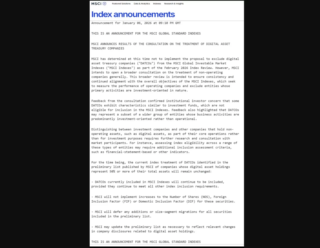 “MSCI decided not to remove digital asset treasury companies from its Global Standard Indices in its February 2026 review.