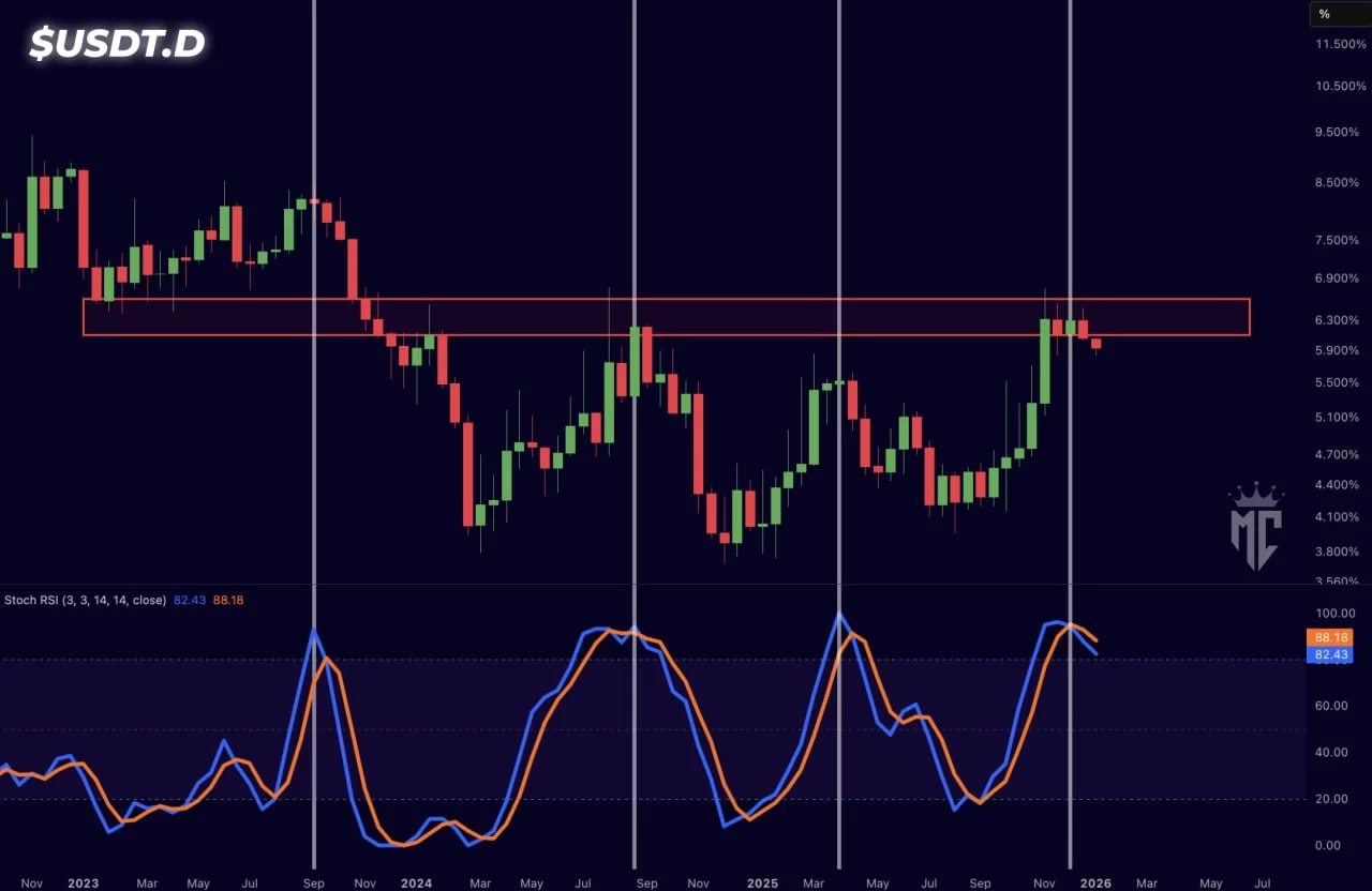 USDT Dominance It started to bounce back from the resistance above. Mister Crypto Stoch argues that we may see a relief rally in the near future as the RSI is also declining.