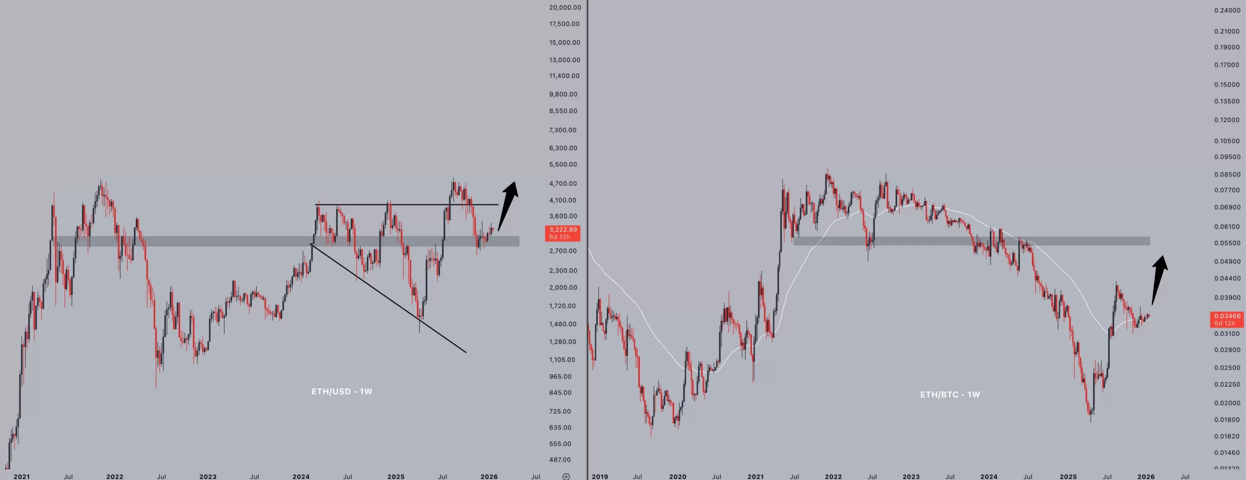 Jelle shared the chart below and wrote that we are heading for a strong jump in ETH price. By breaking the downtrend against BTC, ETH can end the negative divergence period that has been going on for years.