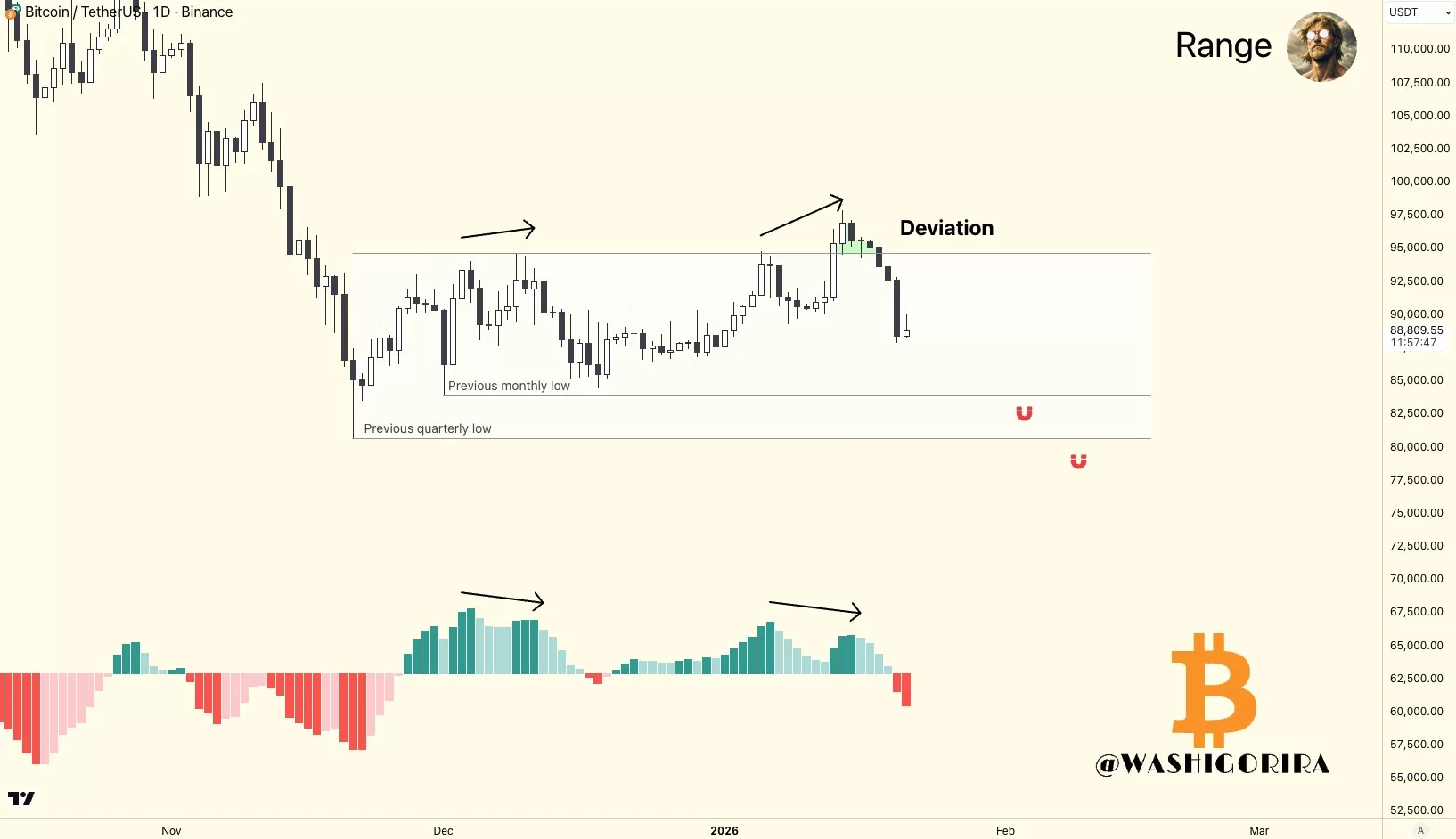 Washigorira is generally known for his optimistic predictions, and even he is uncomfortable with a move back below the impulse candle that initiated the breakout. Stating that this is a negative and notable signal, the analyst says that larger losses may occur as the MACD supports the downward trend.
