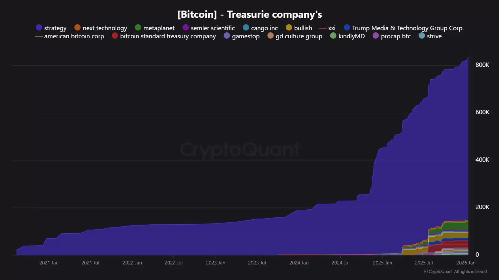 The chart below reflects the buying activity of large institutional investors and reserve companies. Purchases, which weakened in the last quarter of 2025, accelerated again in January and Strategy leads again.