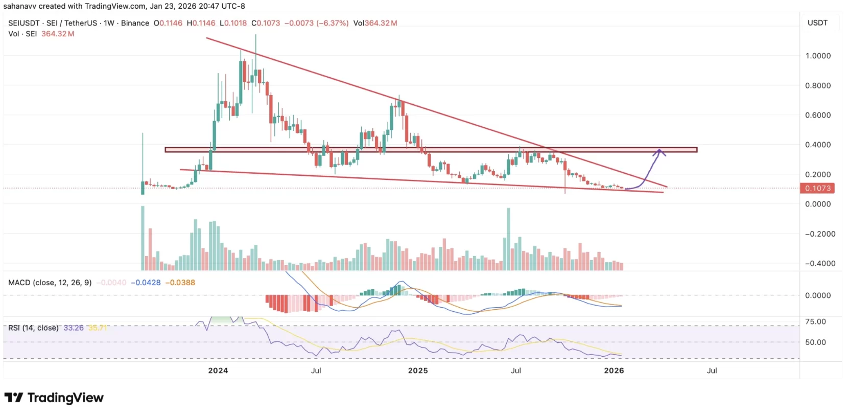 SEI attracted great attention when it was first released to the market, rising above $1.14. However, it then entered a long-term retreat process, creating falling peaks and bottoms due to the bear market. Weekly charts show that the price has been stuck for months and faces strong long-term support in the $0.10–0.12 band.