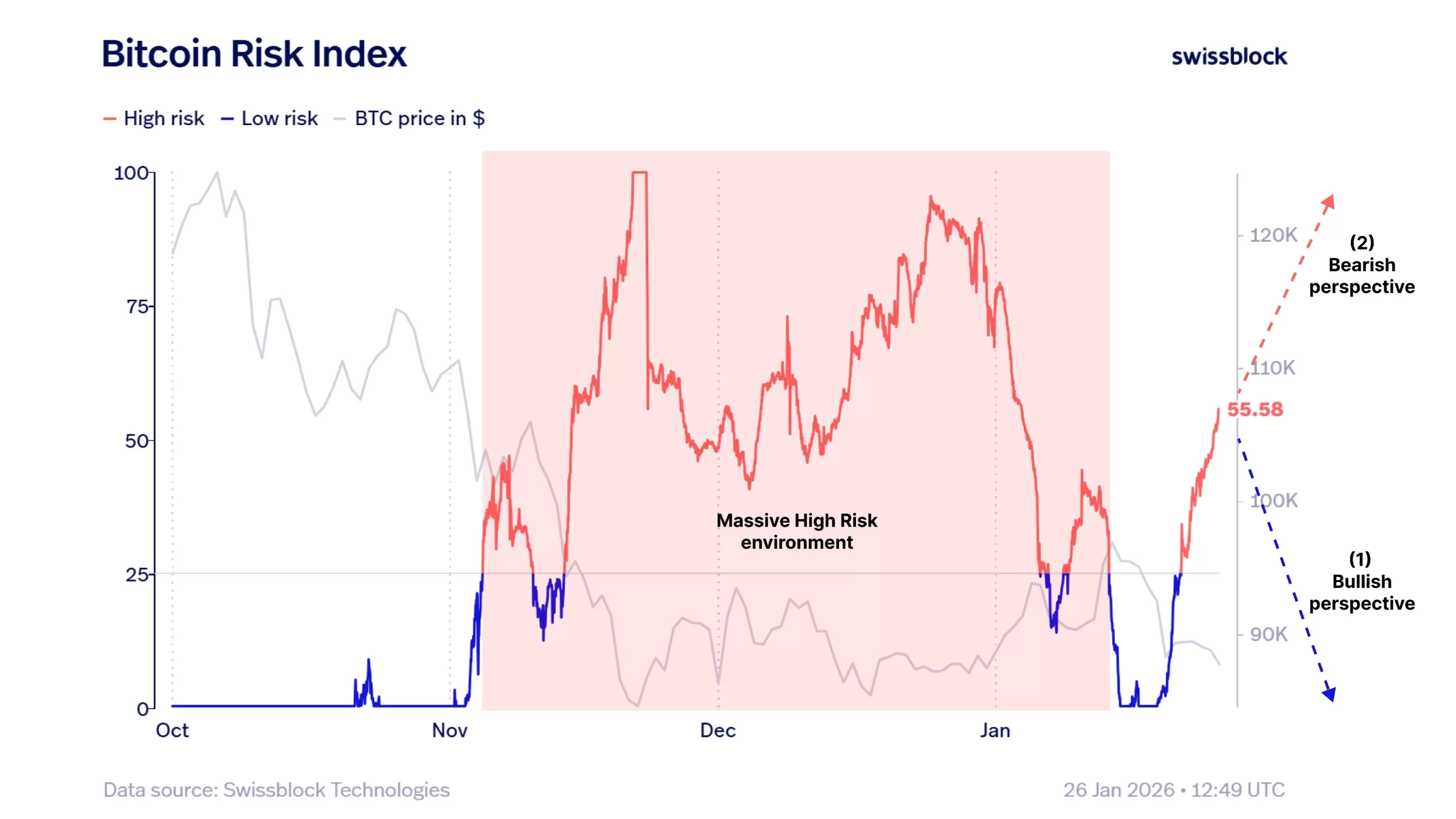Bitcoin risk index Sharing Swissblock discussed 2 scenarios awaiting investors on the chart below.