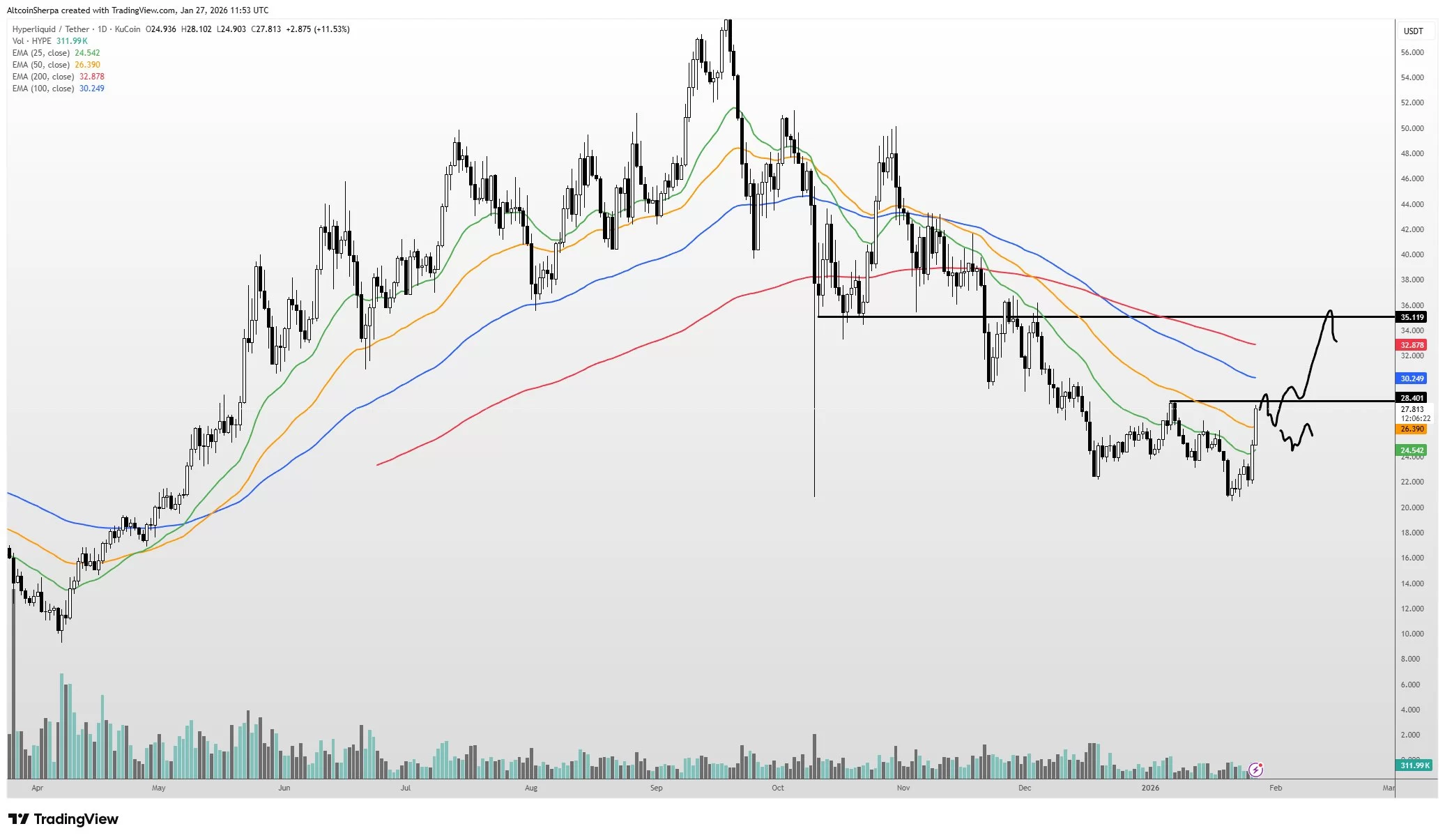 Sharing the chart below, Sherpa is hopeful for his favorite altcoin, Hyperliquid (HYPE). Analysts are hopeful, expecting the price to rise to at least $35.