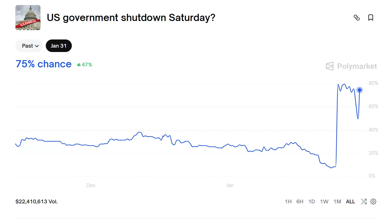 The probability of a government shutdown on Saturday reached 75% at Polymarket.