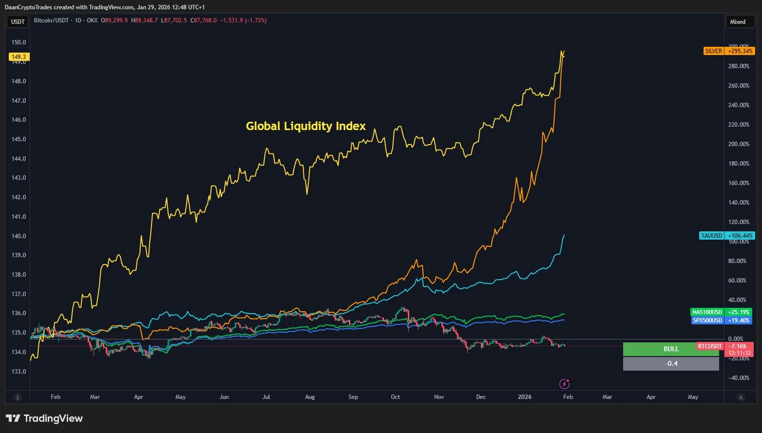 Since the Global Liquidity Index started to accelerate at the beginning of 2025, we have seen rapid movements almost everywhere except cryptocurrencies. Although the BTC price started an early rise after Trump won the elections, it could not make significant gains in the sequel. DaanCrypto shares the chart below and says that 2026 will be extremely interesting.