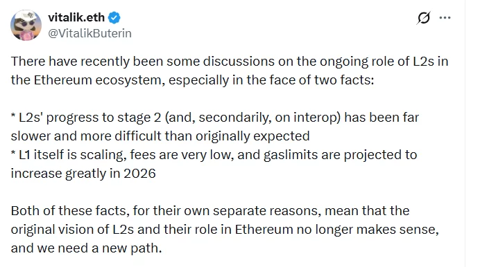 These two facts show, each for separate reasons, that the original vision of L2s and their role in Ethereum no longer makes sense and we need to take a new path.” – Vitalik Buterin