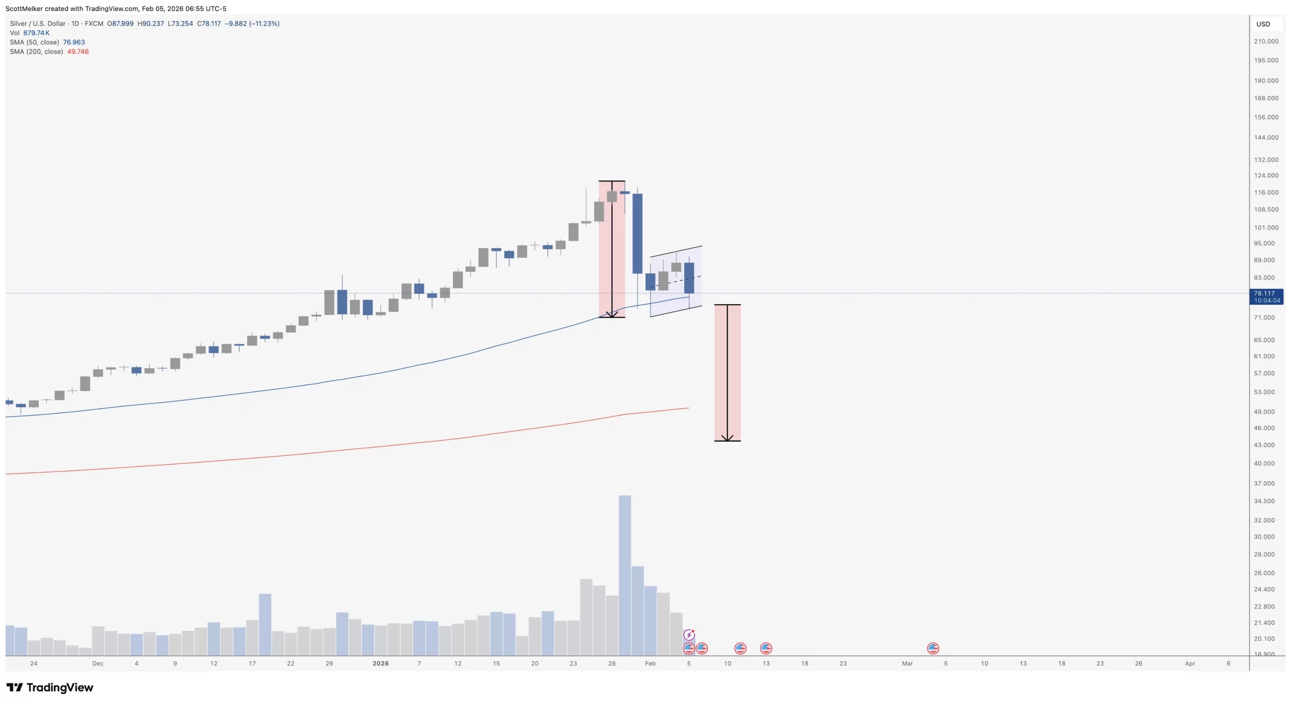 Scott Melker says the large volume increase seen at the top indicates a decline silver He shared the following goal for: