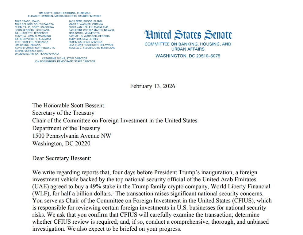 Massachusetts Senator Elizabeth Warren and New Jersey Senator Andy Kim asked the Committee on Foreign Investment in the United States (CFIUS) to review the UAE-backed company’s share purchase of World Liberty Financial (WLFI). They sent the letter to Bessent, as he chairs CFIUS.