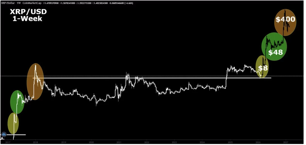 A break above $1.50 could bring up $1.60 and $1.80 as next resistance levels. However, failure to maintain $1.30 could trigger selling pressure again. Investors are monitoring both legislative progress and technical levels. According to crypto analyst Crypto Bull, if XRP repeats the 2017 fractal, its next price targets could be $8, $49, and $400.