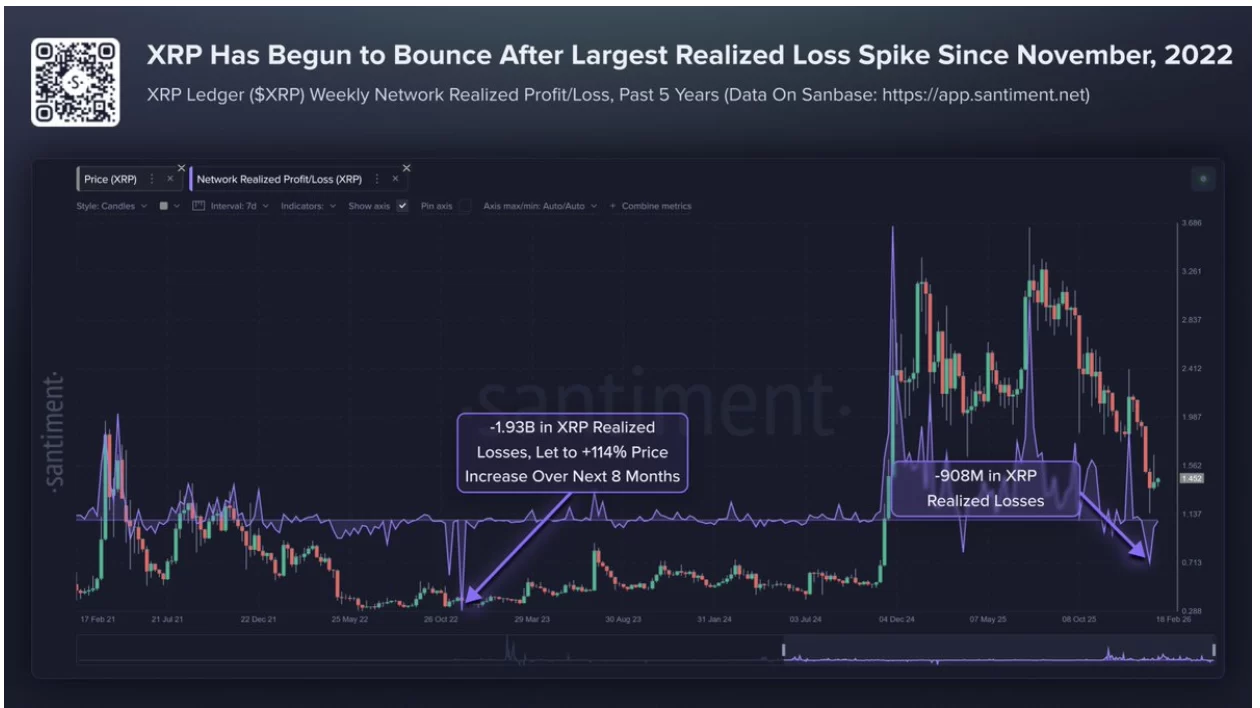 On February 22, Santiment reported that XRP experienced its largest realized loss increase since 2022. At that time, losses reached $1.93 billion, and XRP doubled in the following months. Realized losses increase during panic periods when investors sell below cost. Historically, these processes reduce selling pressure after weak hands are eliminated.