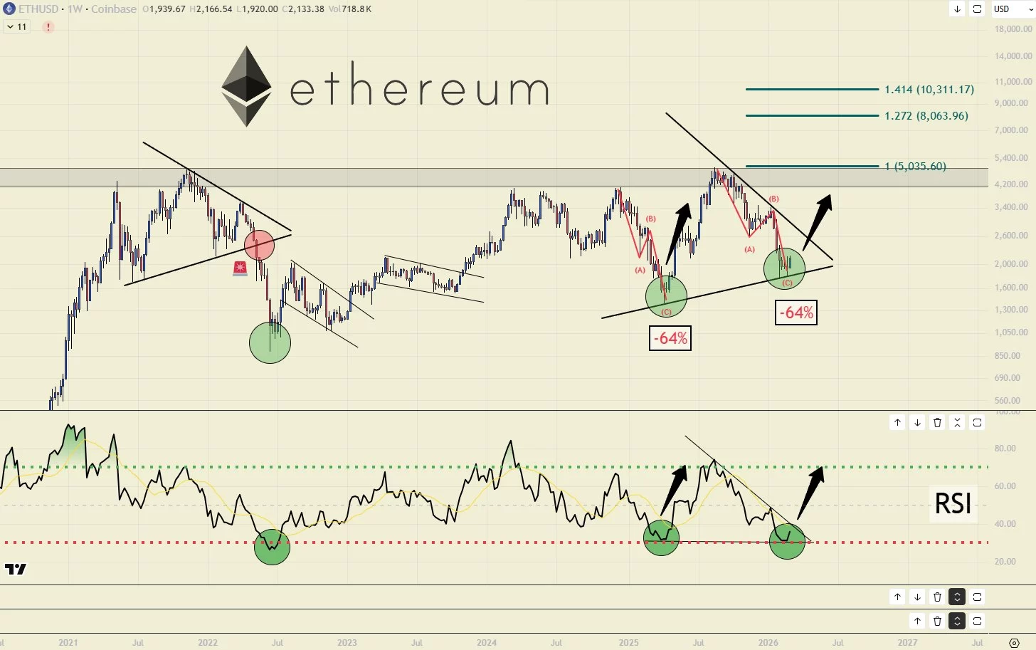 Other big signal ETH ABC correction on chart. BACH also draws attention to the chart above and says that a strong upward phase should begin after the 64% correction. The rise of ETH is very important for a permanent recovery in altcoins.