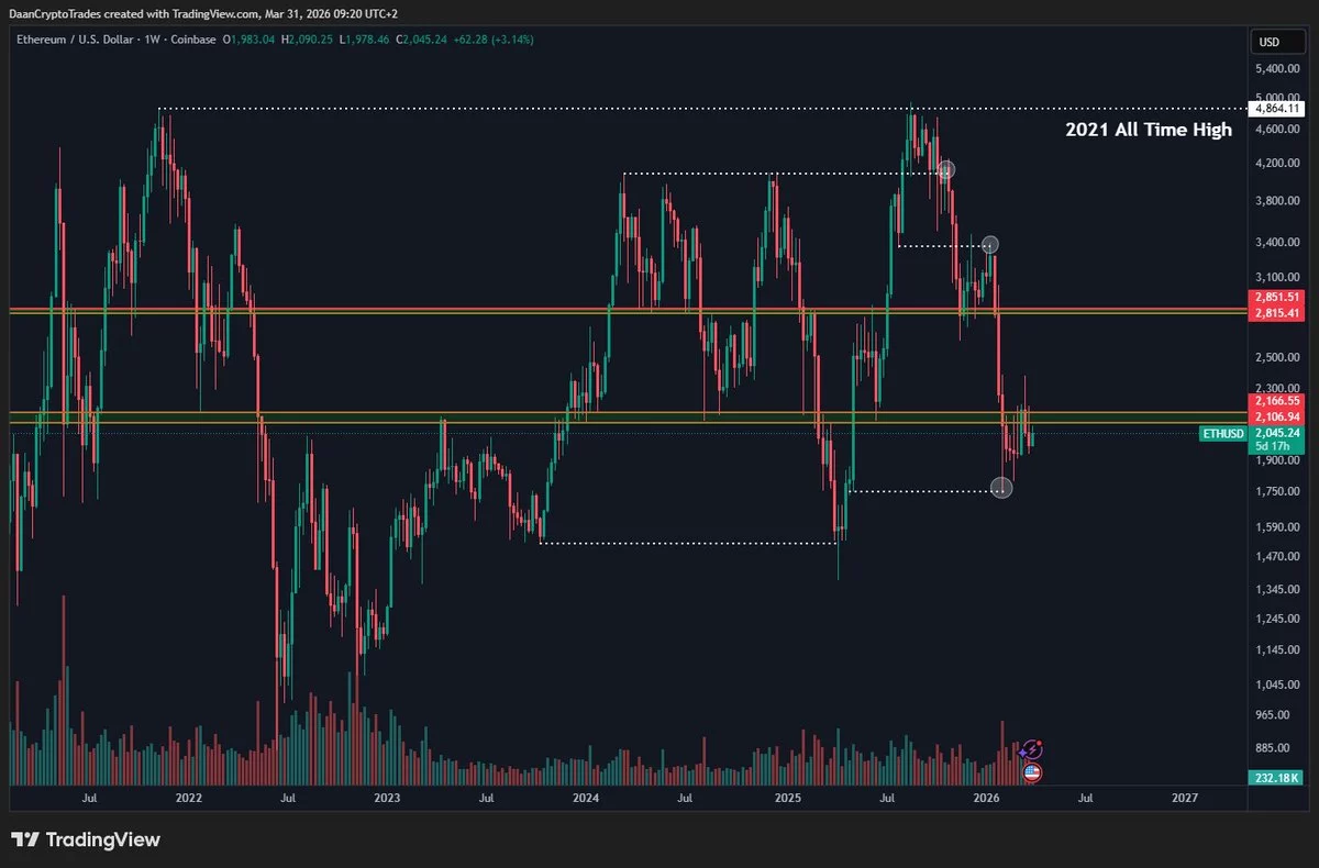 latest development ETH It was also positive for DaanCrypto. ether came upon his warning. ETH, which moved away from the base of 2 thousand dollars with Pezeşkiyan’s statement, exceeded $ 2,090 and is just below the $ 2,100 limit at the time of writing. The analyst with the pseudonym DaanCrypto reminded that this level is extremely important and wrote: