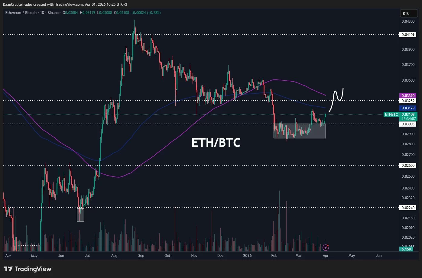 Analyst with the pseudonym DaanCrypto ETHBTC Movement is expected in parity. The return to be experienced here will mean an increase for all altcoins. A retracement of the ~0.032 level and a move above the 200MA/EMA on the daily is essential.