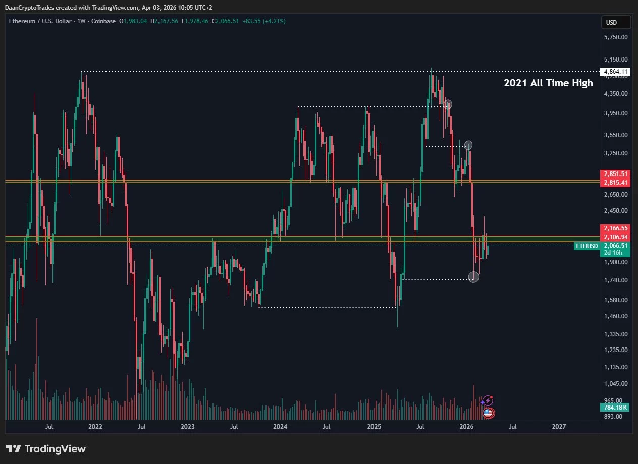 For altcoins to rise, the Ether price must strengthen. However, $2,100 could not be earned permanently. The price is stalling at $2,050 as Trump’s latest statements spoil the appetite. DaanCrypto reminded and warned that if the key area is not reclaimed, the attempts of the last few weeks will turn into unsuccessful attempts to confirm the bearish trend. As stated before ETH He thinks that it would not be right to take a position without leaving the channel.