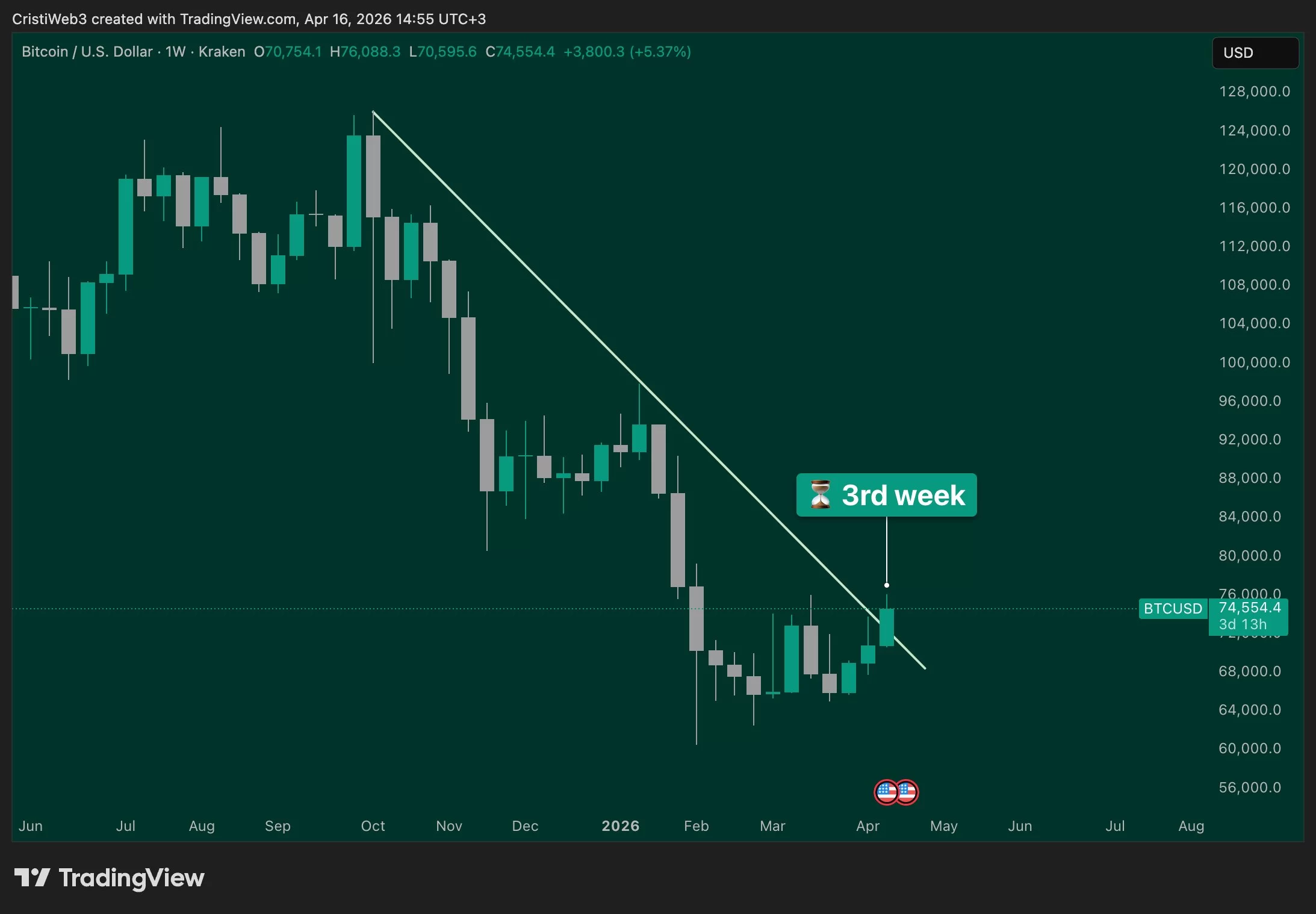 The third consecutive weekly green candle close is approaching, with sentiment at extreme fear levels. Ran Neuner believes that the downward trend is about to end.