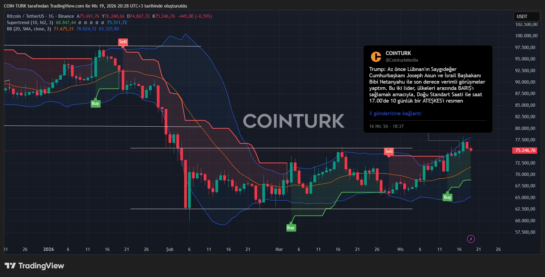At this stage, the military wing says there will be no meeting. Arakchi’s team is ready for talks and Trump will send his delegation to the region. Only time will tell what happens. Cryptocurrencies will continue to zigzag in the middle of this game. Now BTC It lost the channel resistance at $75,700 and it would not be surprising if it tested $68,000 with a loss of more than 10% in the scenario where there are no real negotiations.