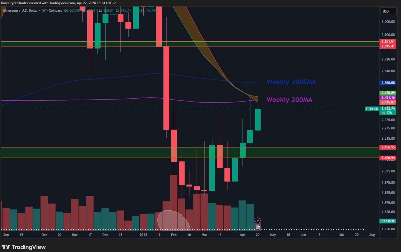 Sharing the ETH chart, DaanCrypto wrote that the $ 2,400-2,500 band is important. If things go well, the altcoin king could test the weekly 200MA. More importantly, a weekly close above 200MA will pave the way for $2,851 and accelerate the relief rally in altcoins.